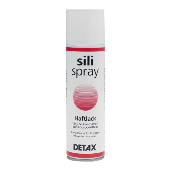 Sili Spray de DETAX se utiliza para la adhesión de materiales de impresión de curado por condensación a plástico, metal y bandejas individuales.
