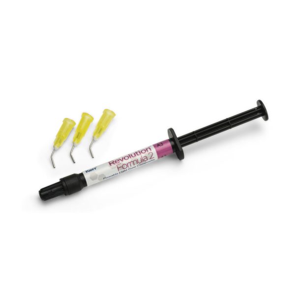 El composite híbrido fluido fotopolimerizable Revolution Formula 2 de Kerr está diseñado para restauraciones de clase III, IV y V. Contiene un 60% de relleno con partículas de 0,6 micras.