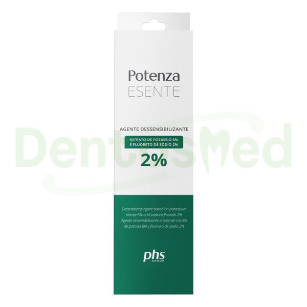 Potenza Esente es un gel desensibilizante especialmente formulado para ser utilizado después de tratamientos de blanqueamiento dental. Contiene Nitrato de Potasio al 6 % y Fluoruro de Sodio al 2 %, ofreciendo una acción combinada que actúa tanto a nivel neural como sobre los túbulos dentinarios, aliviando de forma efectiva la sensibilidad dental.