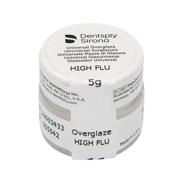 El glaseado High Flu es una masa de glaseado que se emplea en la restauración de circonio totalmente monolítica, para obtener una mayor fluorescencia y regular así el grado del brillo.