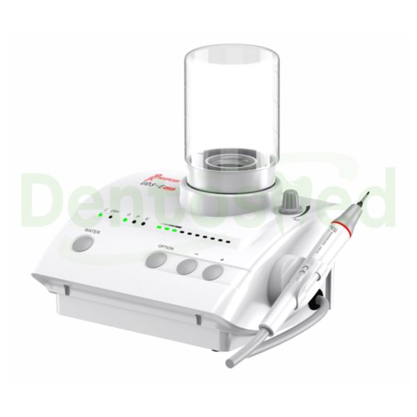 El UDS-E LED es un ultrasonido de sobremesa con luz LED, diseñado para tratamientos rápidos y eficaces. Ofrece tres funciones: Limpieza (G), Periodoncia (P) y Endodoncia (E). Posee 10 niveles de trabajo programables, un sistema autónomo de suministro de agua con doble depósito para distintas soluciones clínicas y una pieza de mano LED ergonómica, desmontable y autoclavable. Incluye 8 puntas surtidas y diversos accesorios.